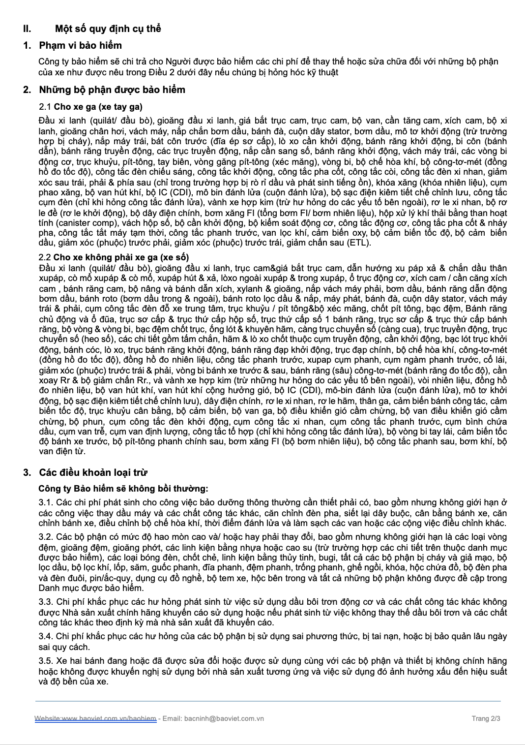 Đầu xi lanh (quilát/ đầu bò), gioăng đầu xi lanh, trục cam&giá bắt trục cam, dẫn hướng xu páp xả & chắn dầu thân xupáp, cò mổ xupáp & cò mổ, xupáp hút & xả, lòxo ngoài xupáp & trong xupáp, ổ trục động cơ, xích cam / cần căng xích cam , bánh răng cam, bộ nâng và bánh dẫn xích, xylanh & gioăng, nắp vách máy phải, bơm dầu, bánh răng dẫn động bơm dầu, bánh roto (bơm dầu trong & ngoài), bánh roto lọc dầu & nắp, máy phát, bánh đà, cuộn dây stator, vách máy trái & phải, cụm công tắc đèn đỗ xe trung tâm, trục khuỷu / pít tông&bộ xéc măng, chốt pít tông, bạc đệm, Bánh răng chủ động và ổ đũa, trục sơ cấp & trục thứ cấp hộp số, trục thứ cấp số 1 bánh răng, trục sơ cấp & trục thứ cấp bánh răng, bộ vòng & vòng bi, bạc đệm chốt trục, ống lót & khuyên hãm, càng trục chuyển số (càng cua), trục truyền động, trục chuyển số (heo số), các chi tiết gồm tấm chắn, hãm & lò xo chốt thuộc cụm truyền động, cần khởi động, bạc lót trục khởi động, bánh cóc, lò xo, trục bánh răng khởi động, bánh răng đạp khởi động, trục đạp chính, bộ chế hòa khí, công-tơ-mét (đồng hồ đo tốc độ), đồng hồ đo nhiên liệu, công tắc phanh trước, xupap cụm phanh, cụm ngàm phanh trước, cổ lái, giảm xóc (phuộc) trước trái & phải, vòng bi bánh xe trước & sau, bánh răng (sâu) công-tơ-mét (bánh răng đo tốc độ), cần xoay Rr & bộ giảm chấn Rr., và vành xe hợp kim (trừ những hư hỏng do các yếu tố bên ngoài), vòi nhiên liệu, đồng hồ đo nhiên liệu, bộ van hút khí, van hút khí cộng hưởng gió, bộ IC (CDI), mô-bin đánh lửa (cuộn đánh lửa), mô tơ khởi động, bộ sạc điện kiêm tiết chế chỉnh lưu), dây điện chính, rơ le xi nhan, rơ le hãm, thân ga, cảm biến bánh công tác, cảm biến tốc độ, trục khuỷu cân bằng, bộ cảm biến, bộ van ga, bộ điều khiển gió cầm chừng, bộ van điều khiển gió cầm chừng, bộ phun, cụm công tắc đèn khởi động, cụm công tắc xi nhan, cụm công tắc phanh trước, cụm bình chứa dầu, cụm van trễ, cụm van định lượng, công tắc tổ hợp (chỉ khi hỏng công tắc đánh lửa), bộ vòng bi tay lái, cảm biến tốc độ bánh xe trước, bộ pít-tông phanh chính sau, bơm xăng FI (bộ bơm nhiên liệu), bộ công tắc phanh sau, bơm khí, bộ van điện từ.