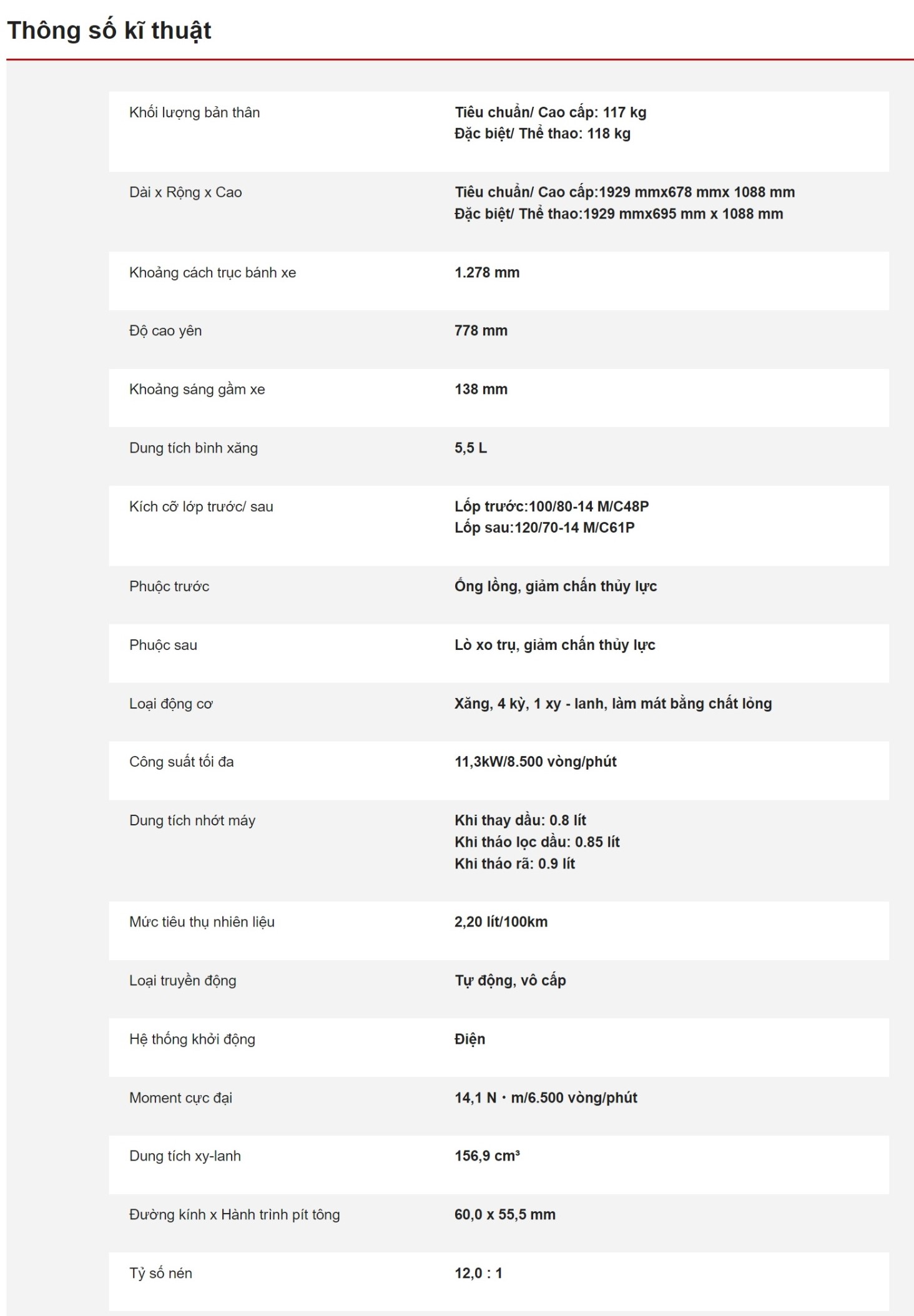 giúp tăng công suất, vận hành êm ái, tiết kiệm nhiên liệu và thân thiện môi trường. Dung tích động cơ 160cc